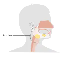 L'incision se localise juste en avant de l'oreille, passe sous le lobule, puis s'étend sur quelques centimètres sur le cou, à la lisière des cheveux ou dans un pli naturel du cou. Cette incision peut être étendue plus bas en cas de nécessité de réaliser un curage ganglionnaire associé.