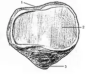 Face postérieure de la patella (1 - Base, 2 - Surface articulaire, 3 - Apex)