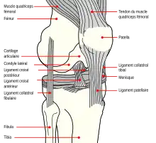 Fémur, tendon quadricipital, ligament ménisco-patellaire, ligament poplitéo-fibulaire, ligament tibio-patellaire médial, rétinaculum latéral de la patella (en), rétinaculum médial de la patella (d), fascia crural, bourse subtendineuse prépatellaire