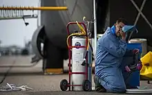 Sur une base aérienne américaine, un répandeur de pesticides enlève son masque de protection au cours d'une vague de chaleur.