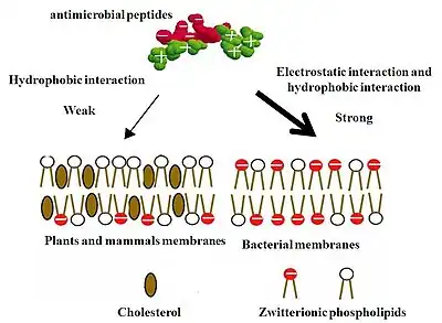 En revanche, la partie externe des membranes des plantes et des mammifères est principalement composée de lipides sans charge nette, car la plupart des lipides avec des groupes de tête chargés négativement sont principalement séquestrés dans la foliole interne des membranes plasmiques[30]. Ainsi, dans le cas des cellules de mammifères, les surfaces extérieures des membranes sont généralement constituées de phosphatidylcholine et de sphingomyéline zwitterioniques, même si une petite partie des surfaces extérieures de la membrane contient des gangliosides chargés négativement. Par conséquent, l'interaction hydrophobe entre la face hydrophobe des peptides antimicrobiens amphipathiques et les phospholipides zwitterioniques à la surface des membranes cellulaires des mammifères joue un rôle majeur dans la formation de la liaison peptide-cellule[34]. Cependant, l'interaction hydrophobe est relativement faible comparée à l'interaction électrostatique, ainsi, les peptides antimicrobiens vont interagir préférentiellement avec les membranes bactériennes. [réf. nécessaire] L'interférométrie à double polarisation a été utilisée in vitro pour étudier et quantifier l'association avec le groupe de tête, l'insertion dans la bicouche, la formation de pores et la rupture éventuelle de la membrane[35],[36].