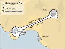 La politique du dirigeant et stratège athénien Périclès consiste à éviter un choc frontal en rase campagne contre les Spartiates. Il abandonne la défense des zones rurales pour défendre Athènes derrière ses murs. Il compte entièrement sur une stratégie maritime : raids de sa flotte de guerre contre Sparte, soutien économique du siège par sa flotte commerciale. La situation est alors propice à une épidémie en temps de guerre : surpopulation urbaine par réfugiés, manque d'hygiène, sous-alimentation, exposition à de nombreux contacts (liaisons maritimes avec le monde méditerranéen)[7]. La ville est reliée à son port, le Pirée, par un corridor fortifié de plusieurs kilomètres, les « Longs Murs ».