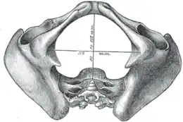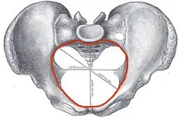 - le détroit supérieur (Apertura Pelvis superior) formé d'avant en arrière, du bord supérieur de la symphyse pubienne, la crête pectinéale, la ligne arquée et le promontoire du sacrum. Il forme, dans un plan fortement oblique en bas et en avant, une figure en forme de cœur chez 50 % des femmes, une forme ovoïde chez 25 % des femmes et une forme triangulaire chez 25 % des femmes et chez la majorité des hommes. La forme la plus favorable à l'accouchement est la forme "cartageux" (en forme de cœur), la moins favorable étant la triangulaire ;