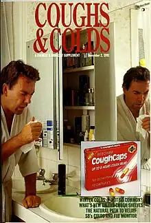 La publicité a créé des produits facilement identifiables, et les a associé durablement dans nos esprit à telle telle affection. Derrière l'étiquette se trouvent souvent des recettes changeantes, habituellement provoquées par des restrictions sanitaires entourant certaines molécules. Dimetapp (en) une marque américaine de médicaments en vente libre était fin des années 1960 une combinaison de maléate de bromphéniramine (en), de chlorhydrate de phényléphrine et de phénylpropanolamine[70]. La phénylpropanolamine a été depuis retirée du marché dans beaucoup de pays et remplacée dans le médicament par de la pseudoéphédrine, elle-même remplacée par de la phényléphrine, cette dernière molécule actuellement sur la sellette[71]. Comme de nombreux médicaments en vente libre, Dimetapp s'appuie sur le marketing et l'image de marque pour se différencier de produits identiques et maintenir des prix élevés.