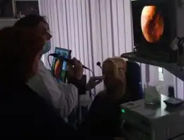 Examen phoniatrique par vidéostroboscopie et enregistrement sonore.