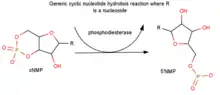 La Phosphodiesterase catalyse la transformation du 3'5'AMPcyclique (forme active) en 5'AMP (forme inactive) en hydrolysant la liaison phosphate présente en 3' sur l'AMPc. La phosphodiestérase est notamment impliquée dans les processus moléculaires permettant la vision en hydrolysant le GMPc en 5'GMP (passage de la forme active à la forme inactive.)