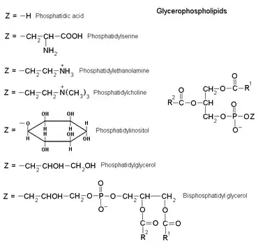 - un autre résidu glycérol, donnant un phosphatidylglycérol ;