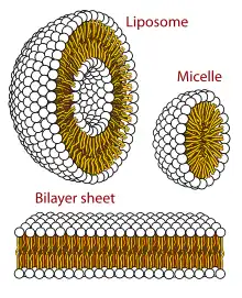 Comme tous les phospholipides, les phosphoglycérides s'organisent, en milieu aqueux, afin de minimiser les contacts entre les molécules d'eau et les queues aliphatiques de leurs molécules, ce qui conduit à des structures en micelle, en liposome ou en bicouche lipidique :