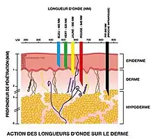 L’utilisation de ces longueurs d’onde correspondent à un champ d’action bien précis et une pathologie bien définie, tel que le démontre l’image à gauche. On voit sur l'image de gauche que la longueur d’onde du bleu agira sur l’épiderme, alors que la longueur d’onde du rouge atteindra le derme et sera donc préférée dans le cas d’une blessure plus profonde par exemple.