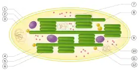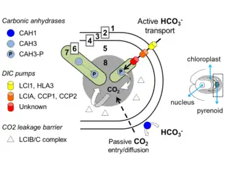 De très nombreuses algues, ainsi que les plantes terrestre de l'embranchement des anthocérotes, disposent de sous-organites (microcompartiments) appelés pyrénoïdes présents dans leurs chloroplastes pour y concentrer le dioxyde de carbone autour de leur Rubisco[21]. Le contenu (matrice) de ces pyrénoïdes est essentiellement constitué de Rubisco[22] et est souvent traversé par des thylakoïdes qui se prolongent dans le stroma du chloroplaste.