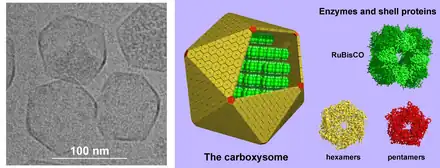 Les cyanobactéries possèdent des organites particuliers appelés carboxysomes qui concentrent le CO2 autour de la Rubisco afin d'en accroître le rendement. L'anhydrase carbonique présente dans ces carboxysomes libère le CO2 stocké dans le cytosol sous forme d'ions bicarbonate HCO3− concentrés dans la cellules de cyanobactérie par un transport actif à travers la membrane plasmique, qu'ils ne peuvent franchir dans l'autre sens en raison de leur charge électrique. Ces ions sont eux-mêmes formés à l'extérieur de la cellule à partir du CO2 dissous sous l'action d'autres anhydrases carboniques situées dans le milieu extracellulaire. Une fois dans le cytosol, les ions HCO3− ne libèrent que très lentement du CO2 sans l'action d'anhydrases carboniques, et diffusent donc vers les carboxysomes, où ils sont traités par des anhydrases carboniques avant d'être fixés par des molécules de Rubisco[26].