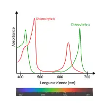 La plupart des organismes photosynthétiques oxygéniques utilisent la lumière visible, cependant ils ne sont actifs qu'à certaines longueurs d'onde, c'est-à-dire qu'ils absorbent ces longueurs d'onde par leurs pigments photosynthétiques. Pour la chlorophylle a, le spectre d'action comprend les bleus et les rouges (longueurs d'onde respectivement autour de 440 et de 680 nm) ; d'autres pigments absorbant d'autres longueurs d'onde, comme la chlorophylle b, les xanthophylles ou les caroténoïdes, jouent un rôle dans la photosynthèse. Certains organismes photosynthétiques utilisent le proche infrarouge ou, plus particulièrement, le rouge lointain[13],[14] (autour de 800 nm de longueur d'onde).