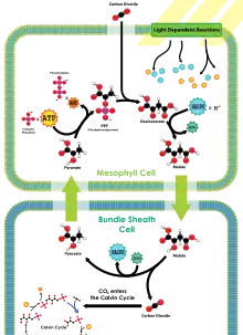 - la fixation du carbone en C4 fait intervenir des composés en C4 pour transporter le dioxyde de carbone, préalablement fixé par une enzyme ayant une plus forte affinité pour le CO2 que la Rubisco, vers les cellules où se trouve cette dernière ;