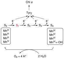 L'eau H2O est la source d'électrons de la photosynthèse chez les plantes et les cyanobactéries. Deux molécules d'eau sont oxydées par quatre réactions successives de séparation de charges dans le photosystème II pour donner une molécule de dioxygène O2, quatre protons H+ et quatre électrons e−. Chacun des quatre électrons transite par un résidu de tyrosine jusqu'au P680 qui sert de donneur d'électrons primaire du centre réactionnel du photosystème II.
