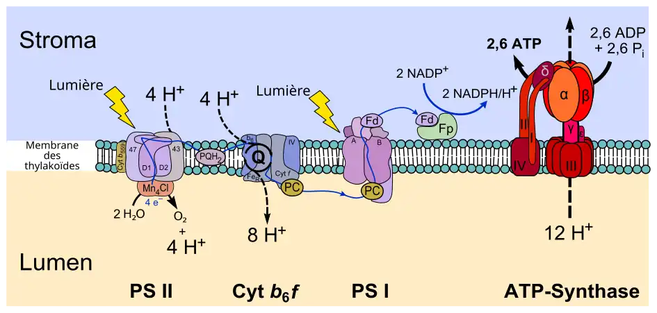 Plus précisément, l'absorption d'un photon par une molécule de chlorophylle P680 du photosystème II conduit à l'excitation d'un électron, qui acquiert suffisamment d'énergie pour être cédé à un accepteur d'électrons par un phénomène de séparation de charges photoinduite. L'accepteur d'électrons primaire est une molécule de chlorophylle dépourvue d'atome de magnésium central appelée phéophytine. De là, l'électron excité passe sur une plastoquinone puis à travers le complexe cytochrome b6f avant d'être transporté sur une plastocyanine jusqu'à un photosystème I. Celui-ci contient un dimère de chlorophylle P700 capable d'exciter un électron par absorption d'un photon, électron transmis par la suite à une ferrédoxine, qui le cède à une ferrédoxine-NADP+ réductase pour réduire une molécule de NADP+ en NADPH.