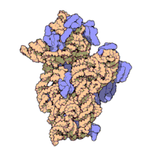 Structure moléculaire de la sous-unité ribosomale 30S de Thermus thermophilus incluant la partie correspondant au 16S. Les protéines apparaissent en bleu et l'ARN simple brin en brun clair[13].