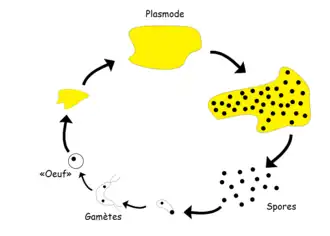 Quand les réserves alimentaires sont épuisées, le plasmode entre en phase de reproduction pour former des sporocystes. Des sporocystes se forment dans le plasmode, la méiose se produit au sein de ces structures et les spores se forment. Les sporocystes se forment habituellement à l'air libre pour que les spores soient dispersées par le vent. Les spores peuvent rester viables pendant des années. Toutefois, lorsque les conditions environnementales sont favorables à la croissance, les spores germent et libèrent des cellules soit flagellées, soit amiboïdes (stade mobiles). Les cellules fusionnent ensuite pour former un nouveau plasmode.