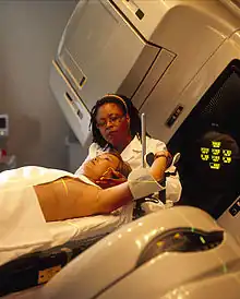 La majorité de l'activité de physique médicale, gérée par les physiciens médicaux, concerne la radiothérapie[28]. Elle se compose de différents domaines que sont la métrologie des radiations ionisantes, la planification des traitements, les contrôles qualité et la radioprotection.