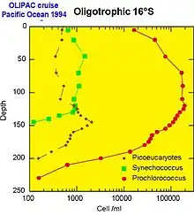 - Prochlorococcus remplace Synechococcus dès que le milieu s'appauvrit (c.-à-d. devient oligotrophe). Par contre en région tempérée (par exemple dans l'Atlantique Nord), Prochlorococcus est absent car les eaux trop froides ne favorisent pas son développement.