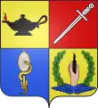 Écartelé : au I, d'or à la lampe antique de sable allumée de gueules ; au II, du quartier des Barons Officiers de Santé attachés aux Armées ; au III, d'azur au miroir d'argent en pal accolé d'un serpent tortillant d'or, se mirant dans la glace ; au IV, d'or à la main de carnation ailée d'azur tenant un scalpel de sable et entourée d'une couronne de chêne de sinople.[4],[5],[6],[7] |