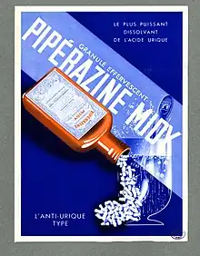 La pipérazine a été initialement utilisée dans le traitement des crises de goutte [6] mais malgré son efficacité in-vitro contre l'acide urique, son interet clinique n'était pas suffisant[7].