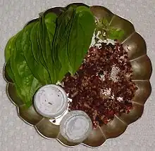 En Inde, au Pakistan, en Birmanie ainsi qu'en Indochine, les feuilles sont mâchées avec de la chaux (oxyde de calcium) et de la noix d'arec, dans une préparation qui prend le nom de bétel ou paan. La chaux agit comme catalyseur, et l'arec contient l'arécoline, un alcaloïde qui favorise la salivation, la salive devenant teintée de rouge. On ajoute parfois du tabac à la préparation, ainsi que divers mélanges d'épices, des additifs astringents et autres adjuvants modifiant la texture et ou la saveur selon l'usage local.