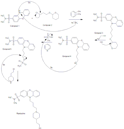Le laboratoire Rhône-Poulenc a réussi à synthétiser la pipotiazine pour la première fois en 1964, à partir d’un composé 1.[ref]