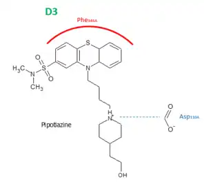 L'amine cyclique de la pipotiazine, protonée à pH physiologique, est un donneur d'hydrogène, par conséquent, elle forme une liaison hydrogène avec l'Asparagine en position 110 sur la chaîne A du récepteur D3.