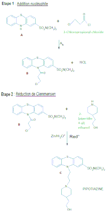 La synthèse de la pipotiazine, décrite ci-dessous, s'effectue en deux principales étapes. Tout d'abord, l'attaque nucléophile de l'amine secondaire du composé A sur le C1 du chlorure de 3-chloropropionyle. Il se forme alors B (un solide blanc) et de l'acide chlorhydrique (HCl). La deuxième étape est une réduction de Clemmensen de B par le 2-(pipéridin-4-yl)éthanol en présence de Zn/H3O+ qui forme la pipotiazine (C).