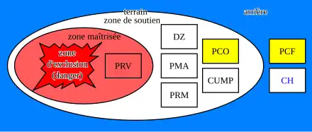 On distingue deux zones : une zone où le danger est encore présent et une zone de sûreté. Tant qu'une zone n'est pas sécurisée, son accès est restreint aux unités chargées de combattre le sinistre. Lorsque le danger ne résulte pas d'une action humaine en cours — typiquement, dans le cas d'une explosion (accidentelle, ou criminelle sans risque de surattentat), d'un accident industriel, d'un accident de transport ou d'une catastrophe naturelle —, la lutte contre le sinistre est du ressort des sapeurs-pompiers ou des unités de sécurité civile. Les services de police — Police nationale, municipale et Gendarmerie — ont pour rôle de restreindre l'accès à la zone, de permettre la circulation des moyens de secours et de débuter l'enquête. Si le danger n'est pas maîtrisé et que la situation risque d'évoluer, les victimes présentes dans cette zone sont extraites d'urgence vers un point de rassemblement des victimes (PRV), hors de danger, où les premiers soins d'urgence leur sont prodigués avant une évacuation vers le poste médical avancé (PMA, un hôpital de campagne) ; si le danger est maîtrisé, les victimes reçoivent un traitement minimal sur place (secourisme de l'avant) et sont évacuées directement vers le PMA. Le PMA ainsi que le point de rassemblement des moyens (PRM), point où doivent se présenter les différents acteurs de terrain, et l'éventuelle zone d'atterrissage d'hélicoptère (drop zone, DZ) sont placés dans une zone dite « de soutien ».