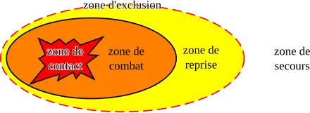 • zone de contact : c'est une zone de danger extrême, similaire à une zone de guerre, dans laquelle la médicalisation est impossible en dehors du sauvetage par le compagnon d'arme ; cette zone est habituellement de faible étendue ;