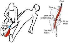 Le premier est le point de compression fémoral, dans le pli de l'aine. On comprime l'artère fémorale contre le fémur (os de la cuisse) ou le bassin, en appuyant le poing fermé, bras tendu, au milieu du pli de l'aine (pli de flexion de la cuisse).