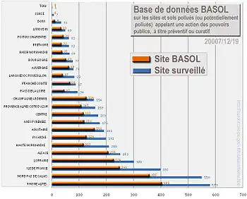 Le nombre des sols répertoriés comme pollués ou pour avoir pu l'être, (ici en France pour la base de données BASOL, telle que mise à jour en ), ou le nombre de sites surveillés reflète le passé industriel des régions. Les pollutions d'origines militaires, agricoles, cynégétiques (plomb) ne sont pas encore prises en compte dans ce type d'inventaire.