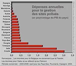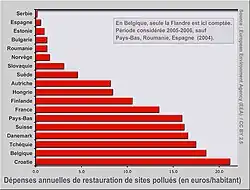 Dépenses annuelles de restauration de sites dans certains pays européens comme d'euros par habitant (source : http://www.eea.europa.eu/data-and-maps/figures/annual-national-expenditures-for-management-of-contaminated-sites-eur-per-capita EEA, European Soil Database /Data and maps, CC-by-2.5.