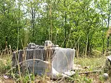 Restes d'une batterie au plomb, cassée et abandonnée en forêt.