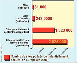 Les sites et sols pollués se comptent par millions sur la planète[3], et ils sont nombreux en Europe (« Agence européenne pour l'environnement », 2023) ou au début des années 2000, on en comptabilisait environ 342 000 sites contaminés et plus de 2,5 millions de sites potentiellement contaminés[4]. La France comptait environ 230 000 sites pollués ou potentiellement pollués par l'industrie ou des services dans le pays[5], dont près de 4 000 faisant l'objet de mesures de surveillance, de diagnostic ou de réhabilitation[5]. Il faudrait y ajouter les anciennes décharges municipales (au moins une pour chacune des 36 000 communes), les pollutions d'origine militaire, agricole, cynégétique (plomb de chasse), etc.