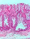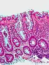 | Adénome dentelé sessile | Semblable à hyperplasique avec hyperserration, bases des cryptes dilatées/ramifiées, des cellules de mucine apparents à la base des cryptes | Oui | ![]() |