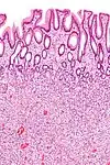 | Adénome tubulaire (villositaire, tubulovilleux) | Glandes tubulaires avec des noyaux allongés (au moins à faible teneur atypie) | Oui | ![]() |