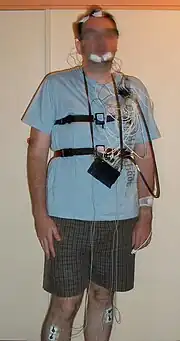 - mouvements respiratoires (par des sangles autour du thorax et de l'abdomen ou par la mesure de l'impédance thoracique, variable avec le mouvement de la respiration),