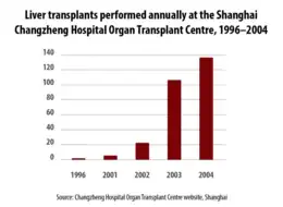 En 2006, la Chine était le deuxième pays au monde comptant le plus grand nombre de greffes, derrière les États-Unis[6],[7]. Alors qu'entre 1994 et 1999 on ne comptait que 18 500 greffes, soit une moyenne d’environ 3 000 par an[8], ce chiffre a culminé à plus de 10 000 greffes de rein en 2004 et près de 4 000 de foie en 2005[6]. Sur les seules greffes de reins, on dénombrait presque 20 000 transplantations en 2005[9].