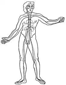 Cependant, il est à l'origine de l'idée que les artères ne contiennent pas de sang, mais répartissent de l'air ou plus exactement le pneuma (souffle de vie)[13],[14], ce qui représente selon Harris « une erreur tragique de la médecine grecque », lourde de conséquences car obstacle principal à la découverte de la circulation sanguine[4],[15]. Le cerveau joue un rôle mineur, ce n'est qu'une simple excroissance, un prolongement crânien de la moelle spinale[2].