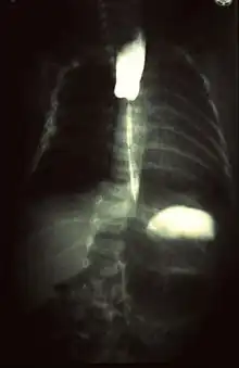 Radiographie de transit œso-gastroduodénal utilisant du produit de contraste et montrant une atrésie œsophagienne congénitale