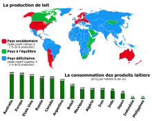La consommation de produits laitiers était à l'origine surtout présente dans la cuisine européenne (et plus largement occidentale), moyen-orientale, sahélienne/soudanienne[2], est-africaine[2], indienne, tibétaine, mongole et d'Asie centrale et beaucoup moins dans la cuisine est-asiatique, amérindienne et d'Afrique équatoriale. Elle a toutefois connu une croissance considérable au niveau mondial depuis le début des années 1950, notamment en Asie de l'Est (Chine, Japon Corée, etc.) où ces produits étaient traditionnellement moins consommés. Elle reste toutefois faible en Afrique équatoriale. Les produits laitiers constituent l'apport indispensable en vitamine B12 pour les végétariens. Les végétaliens, qui excluent les produits laitiers de leur alimentation, doivent eux obligatoirement recourir à la supplémentation par ingestion de vitamine B12[3] obtenue par l'élevage et la multiplication industrielle de bactéries[4].
