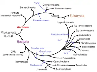 Admettant la théorie de la fusion des génomes entre Bactéries et Archées (pour engendrer les Eucaryotes), d'autres biologistes comme Rivera et Lake (2004)[27] tendent à remplacer l'image de l'arbre phylogénétique des Procaryotes par une forme circulaire, ou « anneau » de la vie [28],[29].