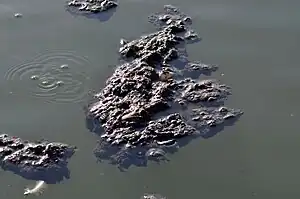 Les bactéries sont responsables de la remontée de bulles de méthane et de flocs bactériens, à partir des sédiments anoxique et très riches en matière organique (ici sur la Basse-Deûle un jour férié sans circulation de péniches)