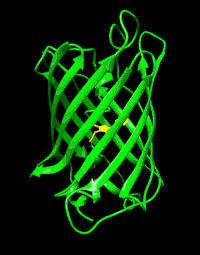 Animation présentant la protéine fluorescente GFP, (avec son chromophore en jaune)