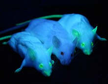 Souris possédant et exprimant le gène de la GFP sous lumière UV (gauche et droite), par rapport à une souris normale (centre).
