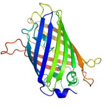 La GFP a été décrite pour la première fois en 1962. Elle est constituée de 238 acides aminés pour une masse moléculaire d'environ 27 kDa. Le chromophore (centre actif responsable de la fluorescence) est constitué par les chaînes latérales d'une glycine, une tyrosine et une sérine.