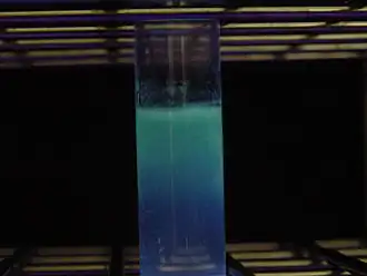 Production de pyoverdine, soluble dans l'eau, pigment fluorescent vert-jaune de Pseudomonas aeruginosa. Ps. aeruginosa en culture sur milieu gélose CNA doux. Les bactéries aérobies ne poussent que sur la surface du milieu (formation de biofilm blanchâtre), et le pigment fluorescent diffuse vers le bas (observé sous lumière noire).
