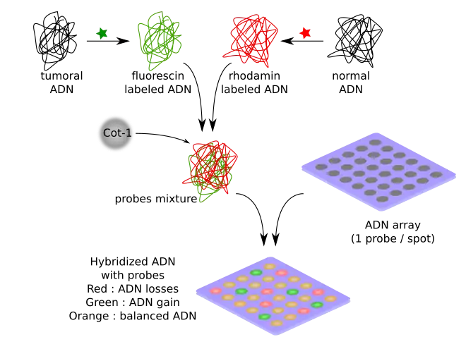 Dans la puce d'hybridation génomique comparative, les chromosomes en métaphase sont remplacés par des oligonucléotides fixés sur une puce. Ces oligonucléotides sont produits par clonage sur bactéries, par transcription inverse d'ARNm (ADNc) ou par synthèse in situ. Il est ainsi possible de déposer plusieurs milliers de sondes sur une puce, chaque sonde dérivant d'un gène connu du génome.